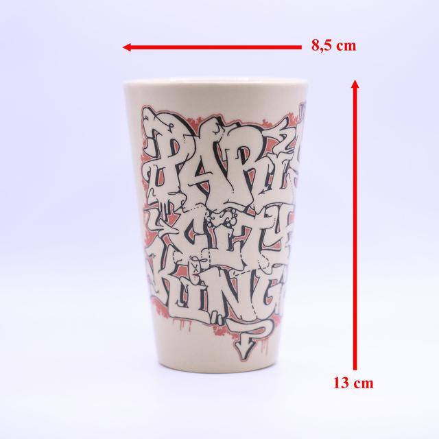 Tasse en grès porcelainique (mélange de grès et de porcelaine) émaillée en transparent et rehaussée d'un décor façon graffiti, sur lequel est écrit "Paris City Kingz". Cette tasse est issue d'une collaboration avec le street-artist "Woner" !